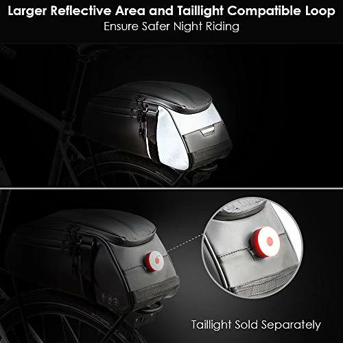 - Large Reflective Area — Unique designed large area reflective fabric to increase visibility at night, together with the rear loop for taillight(not included), WOTOW bike rack bag ensues bikers a safer night riding.