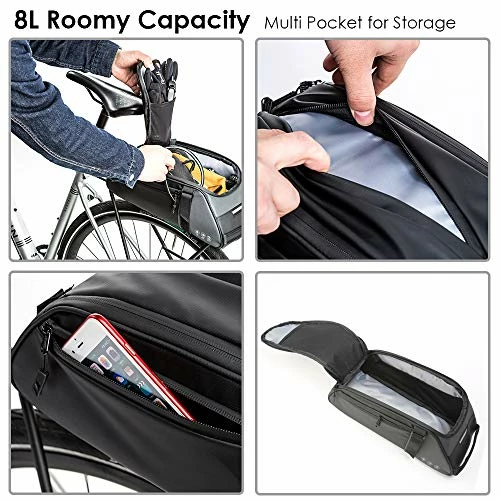 - Tool Free Installation — This bicycle rear seat bag come with 4 adjustable hook and loop fastener straps, make it easy to be installed and unloaded in seconds, suitable for most bicycle racks, such as mountain bike, road bike, electric bikes.