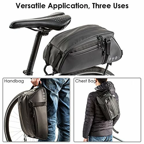 - Rainproof & Built to Last — The bike trunk pack is made of 600D Oxford fabric coated with superior PU film, which is rainproof and easy to clean. The laminated waterproof zipper also help to prevent rain from penetrating in. Exquisite workmanship, durable and firm, provide a long service life.