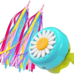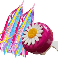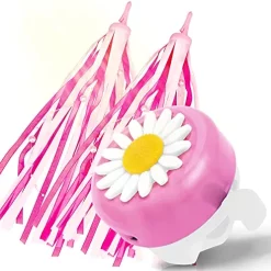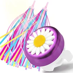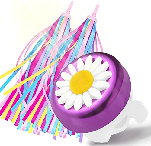 - β 1 Pack kids bicycle bells White & Purple sun flower bells with 1 pair (2PCS) children’s bicycle streamer. A simple and interesting way for kids to dress up their bikes.