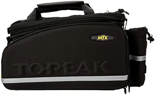 Topeak system is great for the commuter. Depending on what Iβm going to do dictates what options fit. The bag slides on securely with ease. Interior can be sectional with Velcro divider. Sides have zipper pouch running length of bag. Extra water bottle pouch is great. Elastic webbing on top of bag offers fast access. Very well thought out