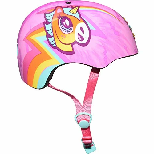 Cute, strong outdoor helmet for my 8 year old, she loves the color, graphics and light up feature. Only issues is planning out the hair style that with fit in the helmet, a hole in the back for a pony tail would help. Having to keep her hair to fit right, gets in her face alot, small issues. The straps are good quality and dont bother the kids,