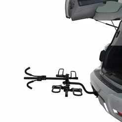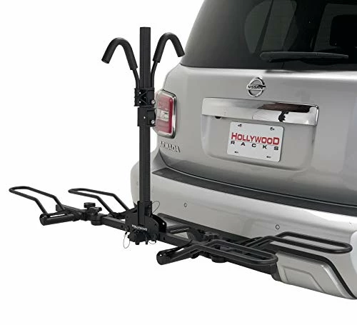 I installed the Hollywood Trail Rider Hitch Rack and my first impression was of the racks insertion into my 2″ receiver. It has a unique block that bolts to the rack. Once inserted into the receiver there is a bolt that replaces the traditional hitch pin. The bolt is threaded through and a cotter pin inserted for safety. This connection results in less sway when driving. The threads in my unit were very corroded. I tried to remove the rust and greased the bolt. This is enough to lower my rating one star.The cradles for the bike wheels slip onto the rack arms with a bit of elbow grease. They are secured with threaded screws that have large knobs. The orientation for the cradles was easy to determine by the diagram and the well written instructions. The thickly padded hook shaped hold downs slide on by squeezing the locking clips. The rack arms pivot upwards to make it easy to store and makes it much easier to handle the rack when installing or removing. By the way these rack arms are secured into their positions with pins inserted in both the upright and lowered positions. When folded the rack is very compact. It’s heavy but about the size of a suitcase.When positioning one bicycle on the rack, the instructions suggest the inside position be used, you place the bike wheels into the cradles and slide the hold down onto the top tube. I donβt do thisunless I have to. The pedal can easily rotate and scratch my car bumper or trunk lid. Instructions also suggest the hook be positioned as close to the seat tube as possible. If one is transporting a fat bike, Hollywood sells a set of cradles that are in excess of four inches wide. They are presently $55.65 on Amazon.After a year of use the ratcheting mechanism on the hold down hook failed. I contacted the company and was provided with a new hook. Kudos for a company that stands behind it’s products. I added a full star to the review for this reason.This rack is a terrific buy and is a very sturdy, effective and secure method for carrying most every standard bike.A short note. The Hollywood Trail Rider Rack is heavy. When handling and assembling it is quite clumsy. Be careful not to ding your car or pinch your fingers.Minor issue. Rust is showing up at a couple of locations on the rack. Easily remedied by applying rust converter.Update 8-12-20: I sold this rack and purchased the new model mostly so I could tilt away the rack to load the βinsideβ bike and to be able to fold the rack up next to the vehicle when not in use. Neither of these functions were available on this old rack. Iβm sticking with Hollywood for now.