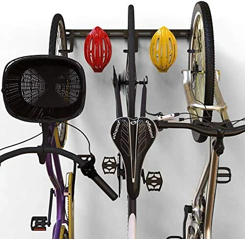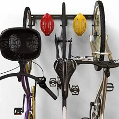 This is a good bike rack, but storing three bikes is a bit cramped. There is no way you could practically hang two bike helmets on this and be able to get to them easily. I would like for it to be a bit bigger, but it is working–so I give it 4 stars.